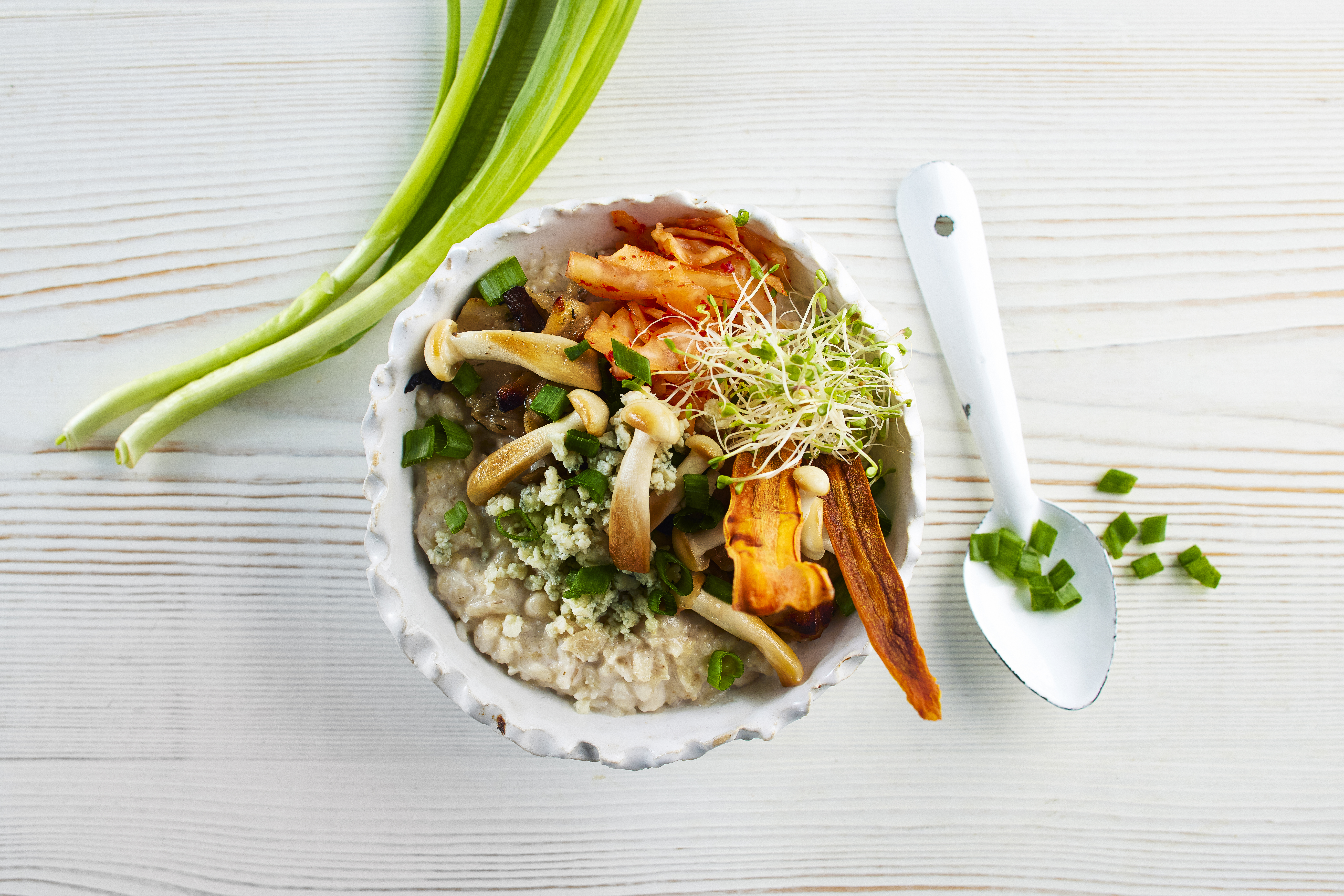 - Annostele puuro lautasille, asettele paistetut Shimeji-sienet, porkkanalastut, hapis-kimchi, leikattu kevätsipuli ja tuoreyrtit lautaselle ryhmiksi ja tarjoa kuumana.